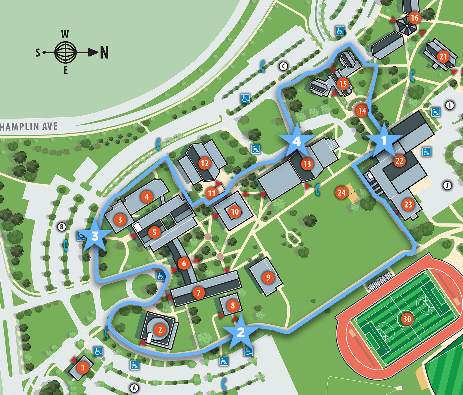 - Follow the walking path outlined in black on your map heading southwest and then turning left at the corner of the Athletic Center, and continuing past the length of the facility.